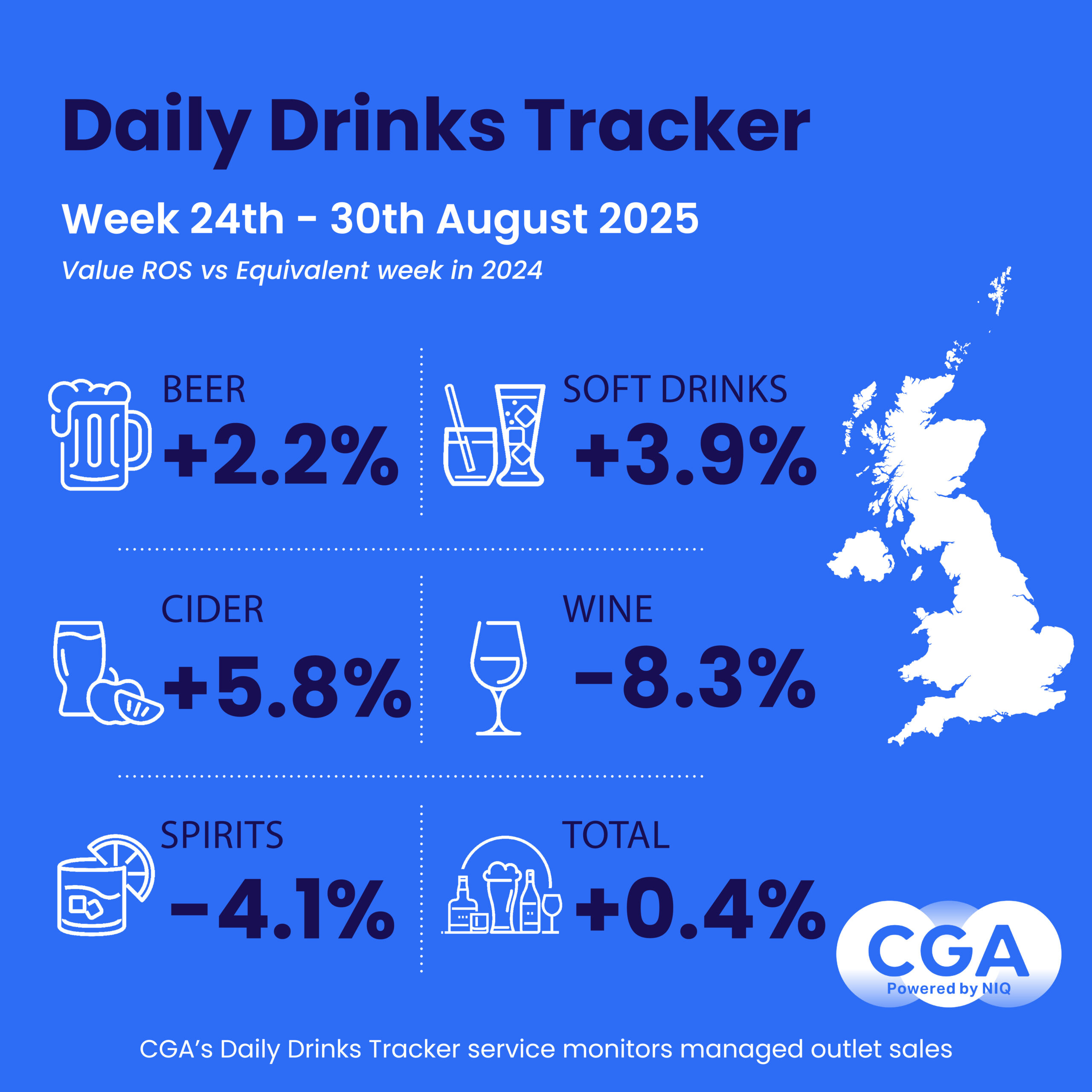 The Daily Drinks Tracker provides analysis of sales at managed licensed premises across Britain and is part of CGA by NIQ’s suite of research services delivering in-depth data on category, supplier and brand rate of sale performance. To learn more, click here and contact the CGA by NIQ team.