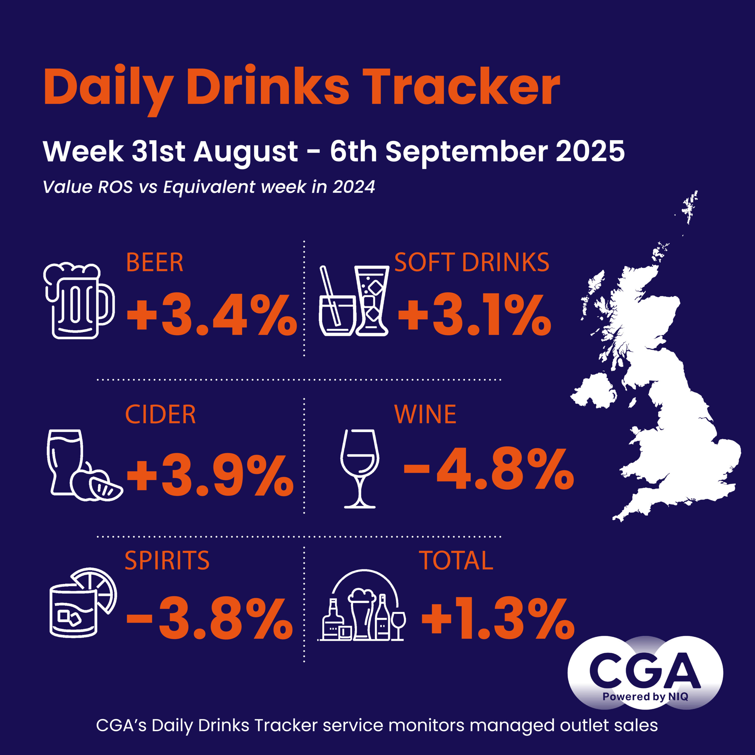 Average drinks sales in managed On Premise venues in the week to Saturday 6 September were 1.3% ahead of the same period in 2024. This follows growth