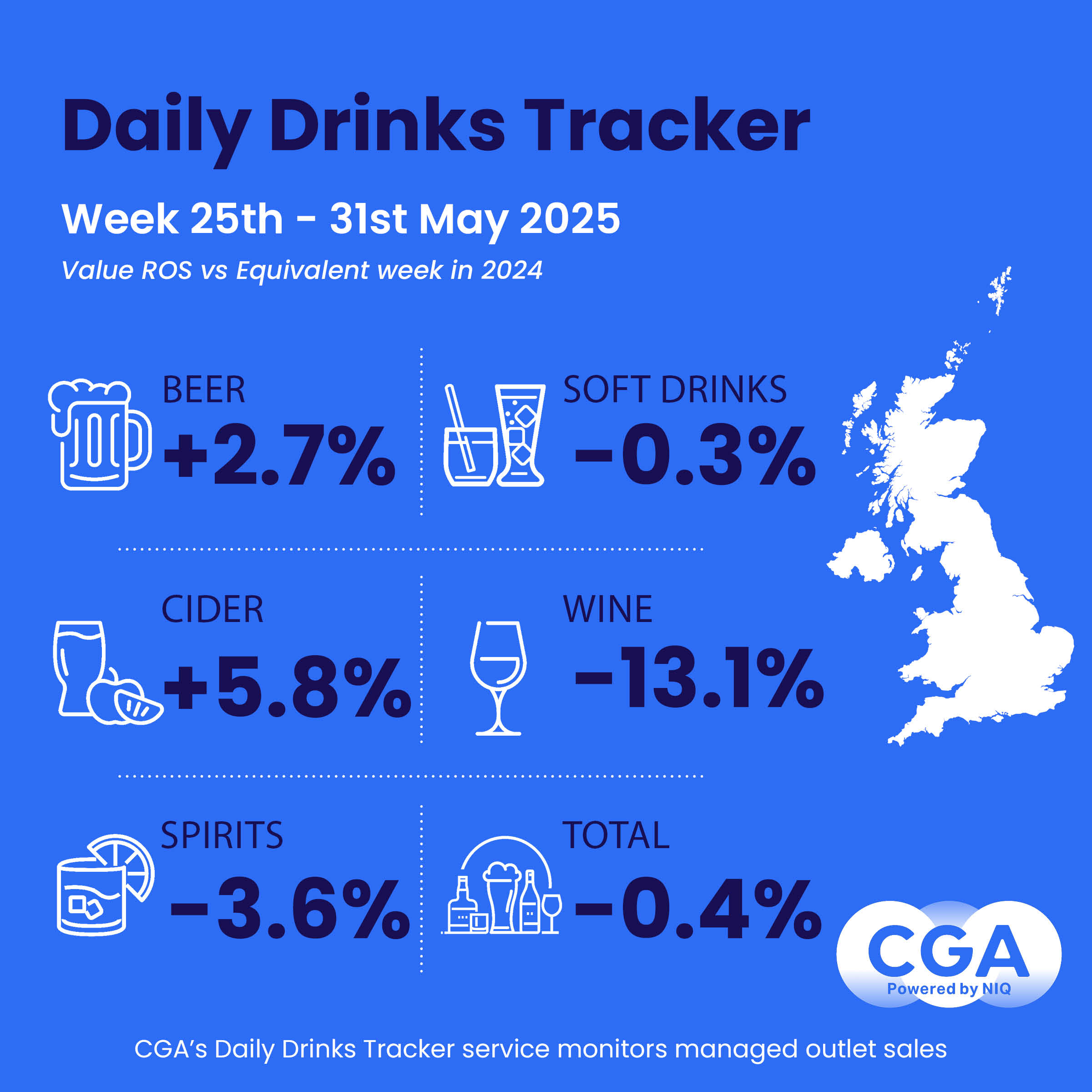 Sales in the week to 24 May were 2% ahead of the same period in 2024, while the following seven days to 31 May brought a fractional decline of 0.4%. It completes a soft May for the On Premise after a mixed first fortnight, thanks in part to rain in many areas of Britain. However, after a very bright Spring, which provided year-on-year growth in ten of 11 weeks between February and late April, trends over the medium term have been generally good.
