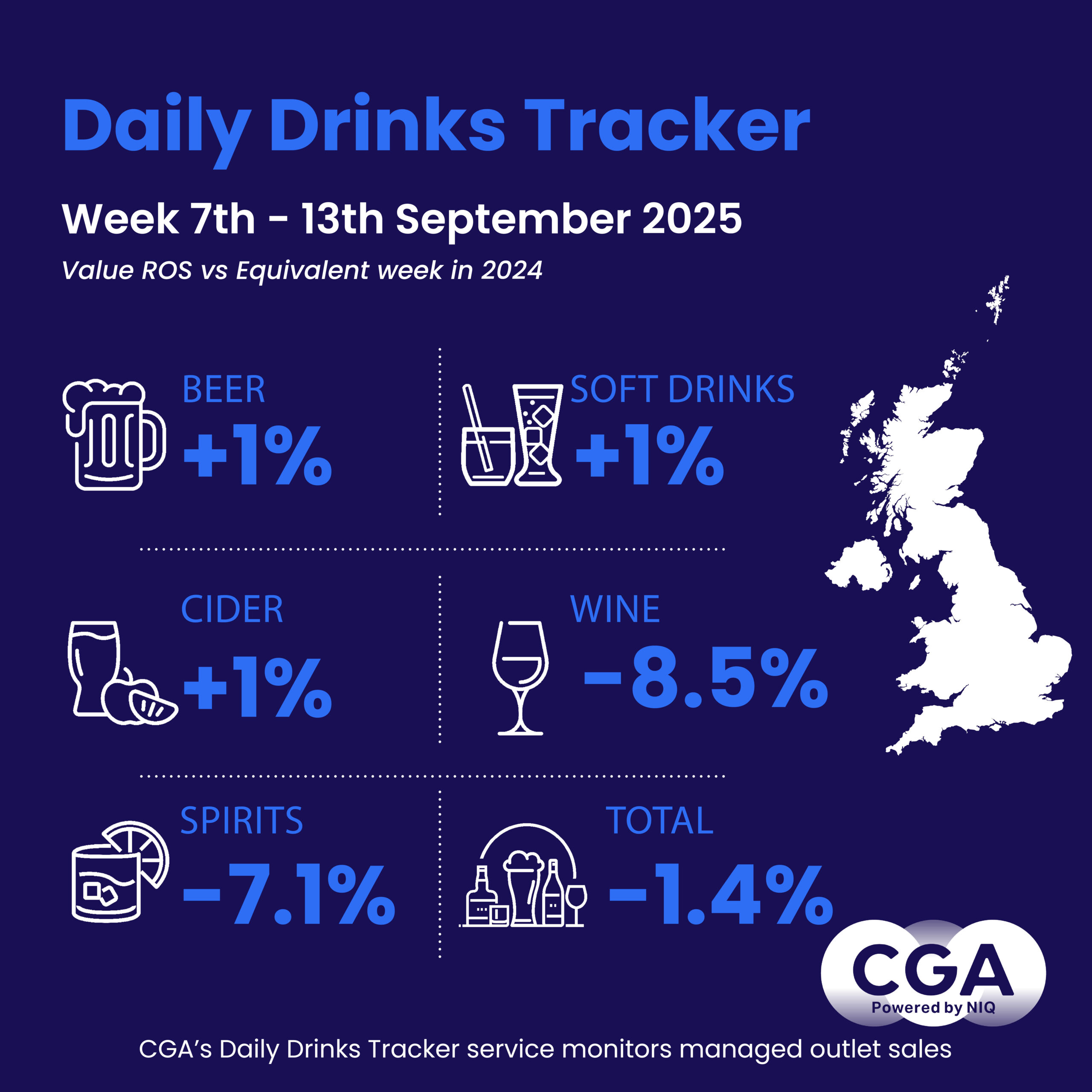 Average drinks sales in managed venues in the week to Saturday 13 September were 1.4% behind the same period in 2024. The gap widened to 3.0% in the following seven days to 20 September. Daily comparisons were ahead on four days of the fortnight, but behind on ten.