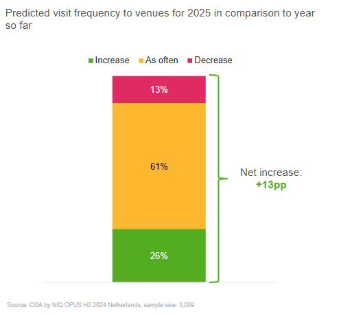 The Dutch HoReCa sector is showing signs of recovery, despite current challenges. Predictions for 2025 indicate an increase in visit frequency, with a quarter (26%) of consumers expecting to visit venues more often than they have in the past year. This is a clear sign for the sector to leverage these insights to refine strategies and capitalise on emerging consumer behaviours as market conditions stabilise.